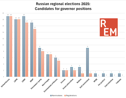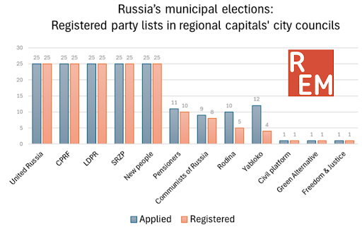 As in the gubernatorial elections, the most active among the non-parliamentary parties were the CPRF spoiler parties — the Pensioners’ Party (in seven regions) and Communists of Russia (in four regions). Notably, neither party faced a single registration refusal, underscoring the Kremlin’s interest in their participation.
