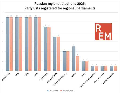 Compared to the 2020 elections, party activity has declined: in those same 11 regions, 125 lists were nominated for regional legislatures in 2020, compared to just 74 in 2025. Similarly, 93 lists were registered in 2020, versus 71 in 2025.