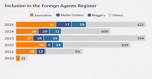 The number of new journalist foreign agents more than doubled compared to 2024, rising from 26 to 61.